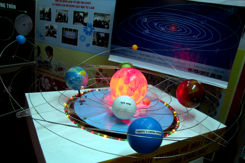 | | Các hành tinh trong hệ mặt trời, sự chuyển động của trái đất cũng được giáo viên thể hiện bằng mô hình thực tế. Để hoàn thiện dụng cụ này họ phải mất nhiều ngày nghiên cứu và lắp đặt. | |